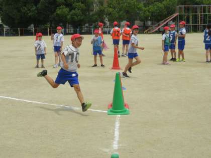 体育では,「リレー」の学習を行っています。今回は,やり方を少し工夫してラッキーマンリレーというルールにしました。ルールは,子どもたちに聞いてみてください。