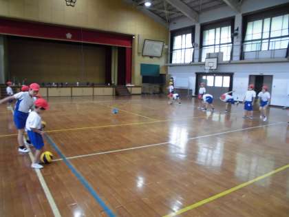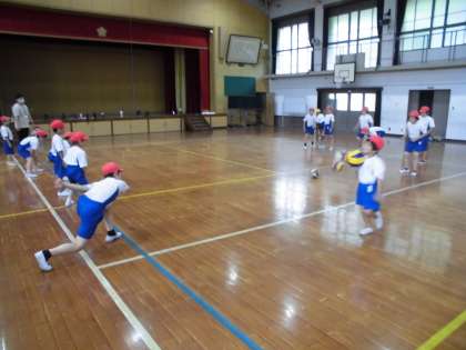 ドッジボール大会に向けて転がしドッジの練習をしました。最後には先生と子どもたちで中あてをしました。みんな笑顔で楽しんで活動できました。