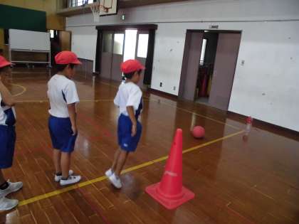 体育館でボールを使って的あてをしました。みんな的をよく狙って投げていました。的を倒すと飛び上がって喜んでいる子もいました。