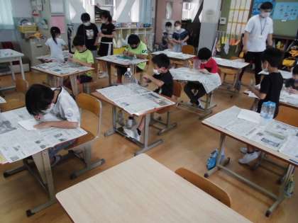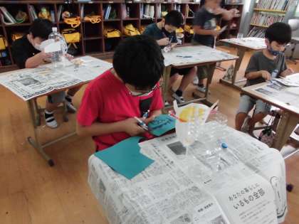 来週の水あそびで使うまとを作りました。自分の好きなキャラクターの顔をつけたり,直接色を塗ったりして,自由に作っていました。