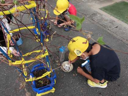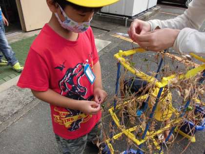 1年生が育てているアサガオのタネをとりました。残ったアサガオのツルはリースにしました。