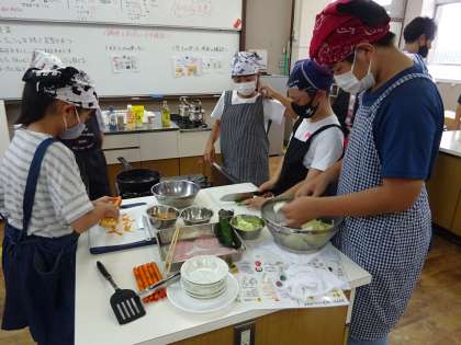6年生となり,はじめての調理実習を行いました。今回のテーマは「いためる」です。材料や調理道具を自分たちで考え,用意し,トライしました。困っている場面では,班の人たちで協力する姿が見られ,「絆」を感じることができました。