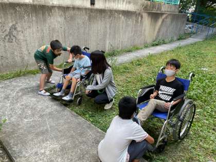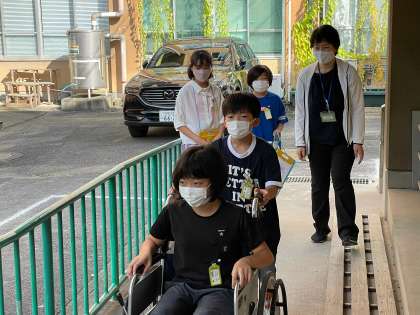 総合的な学習の時間で車いす体験をしました。実際に車いすに乗ってみると「こんなに小さな段差でも車いすではこえるのに苦労するんだ」,「多目的トイレでなければ狭くて移動に苦労するね」,「後ろ向きにスロープを降りるのはとても怖い」など,普段何気なく過ごしている学校の中でも困ることが多くあるということを学びました。