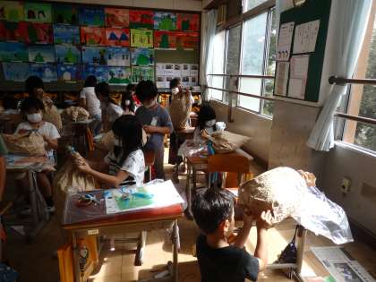 今週は図工科の学習で,生き物や乗り物などのみんなが”ぎゅっ”としたくなるくらい大好きなものを紙や新聞紙使って作りました。初めは,クラフト紙を一生懸命にくしゃくしゃにして,その中に新聞紙を詰めました。カラーモールやおはながみ,リボンなどを巻いたり貼り付けたりして,みんなかわいくて素敵な作品が出来上がりました。