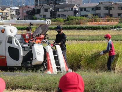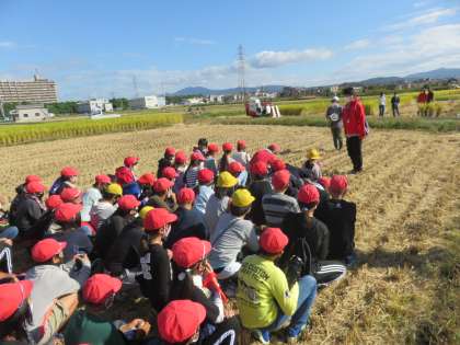 総合的な学習の時間では,地域の方の協力のもと稲刈り体験をさせていただきました。最初に説明を受けて,実際に刈ってみると「かたくてなかなか刈れへん。」「稲の束を結ぶの難しいな・・・。」など苦戦しながらも一生懸命頑張っていました。