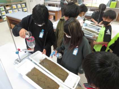 流れる水には一体どんな働きがあるのかを考えました。川に見立てた実験装置を用意し,上から水を流しました。水を流すとどのような変化が起こるのか,じっくりと流れる水の様子を見ていました。1回流しただけで,分かったことと分からなかったことを整理し,次回の実験につなげていこうとしていました。