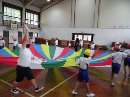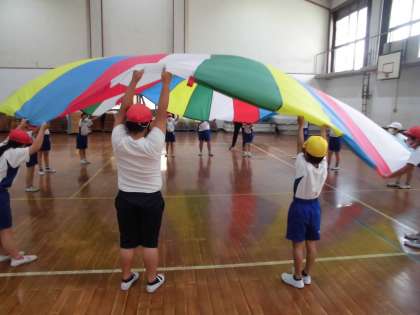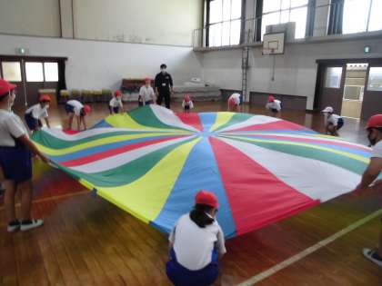 体育でパラバルーンをしました。みんなでタイミングを合わせてパラバルーンを動かしていました。見ているこちらも一体感を感じられました。