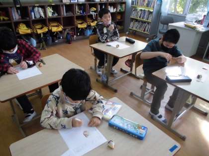 チューリップの球根の観察をしました。その後,自分の植木鉢に植えに行きました。春に花を咲かせるのが楽しみです。