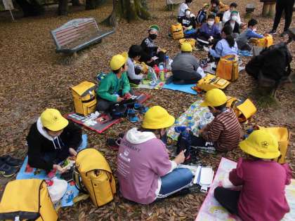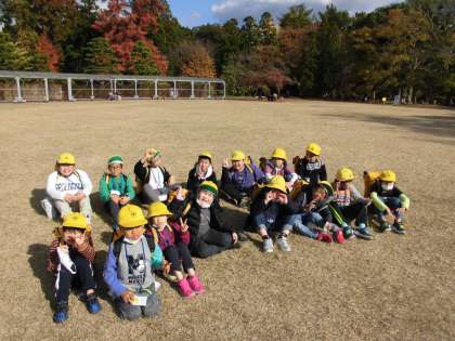 お昼は,お弁当をみんなで楽しく食べました。みんなニコニコでおいしそうに食べていました。その後,芝生で鬼ごっこをしました。