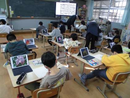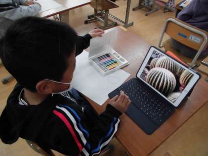 社会見学で植物園に行った時の写真を見ながら,花の絵を描きました。GIGA端末を使うことでよく見たいところは自分でアップしたりして細かいところまで描くことができました。