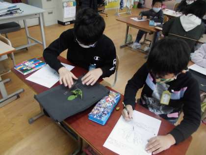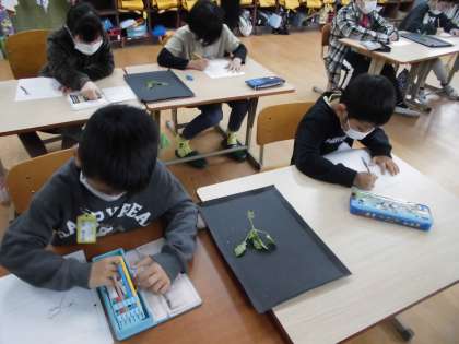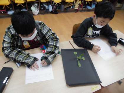 間引きした後の大根のはっぱを観察しました。触り心地や大きさ,色,形など様々な気づきがありました。