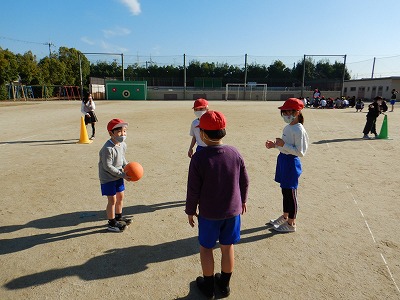 体育科の「パスゲーム」の学習では,寒さにも負けず,運動場で体を動かしています。