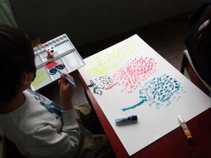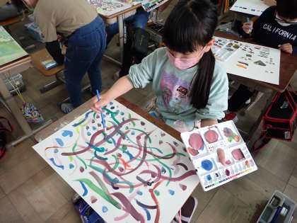図画工作科「絵の具+水+ふで=いいかんじ!」の学習で絵の具を使って絵を描きました。何色も色を重ねたり,水の量を変えたりして未知の色を作りだしたり,知っているけれど作れなかった色を作ったり,みんなで楽しく学習しました。
