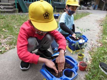 畑に万願寺唐辛子と伏見唐辛子とミニトマトとナスを植えました。個人の植木鉢にも野菜を植えました。子どもたちは収穫できるのを楽しみにしていました。