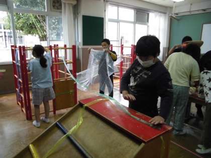 ビニールテープやビニール袋を使って,みんなで教室を大変身させました。秘密基地を作ったり,虹を作ったり,想像力を働かせ,楽しんで活動していました。