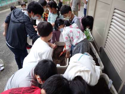 雨が心配でしたが,今朝ギリギリ天気が味方してくれたので,1時間目にみんなで今年育てる4種類の植物の種まきをしました。のびのびと育ってくれるようにトトロやさつきになってお祈りをしました。