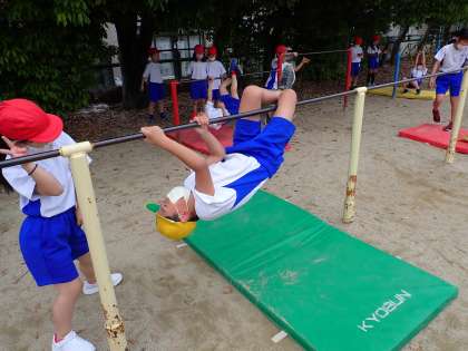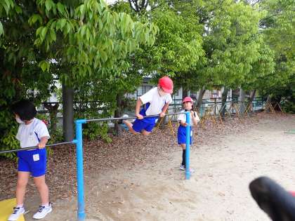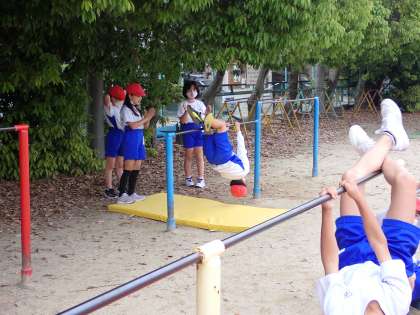 今日の体育から鉄棒が始まりました。今年初めての鉄棒だったので,「逆上がり」などの技は行わず,「つばめ跳び」や「豚の丸焼き」など簡単な技で楽しく行いました。