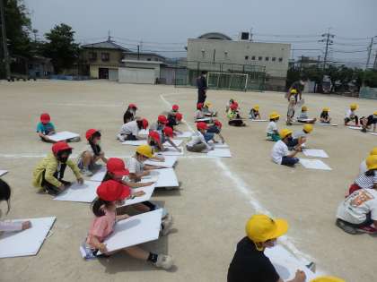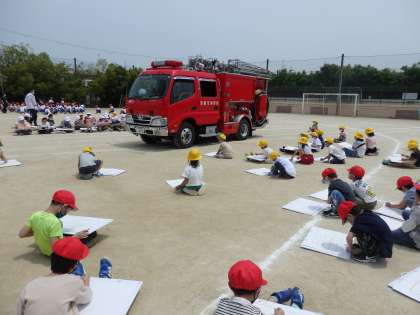 一年生は,避難訓練の後に消防車のスケッチをしました。クレパスを使って画用紙いっぱいに描き,「赤いクレパスがなくなっちゃう〜。」と言いながら,一生懸命,丁寧に塗り進めていました。