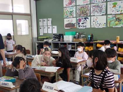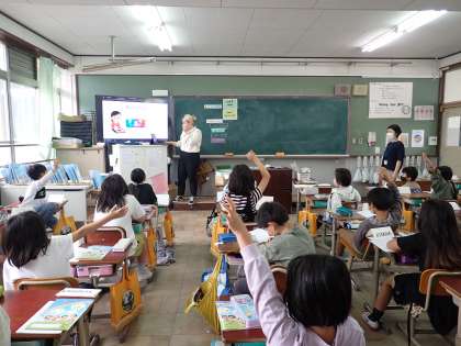 今日の外国語活動の授業で新しいALTの先生と一緒に学習しました。カレン先生は中国・イギリス・アメリカなどいろいろな国に住んでおられたということで,それぞれの国の文化や娯楽について質問をしました。そして挨拶や自己紹介をしました。