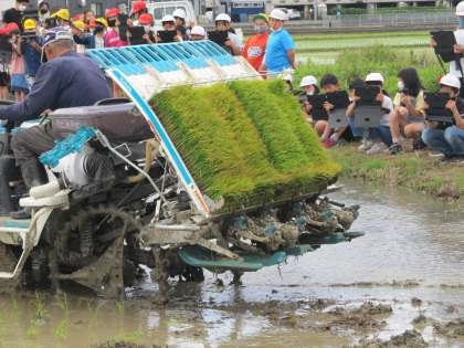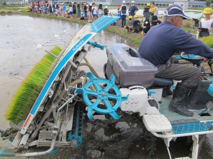 機械がどのように動いているのか,苗がどんなふうに植えられているのか,近くで見ることで分かることがあり,興味津々でした。田植えを見学したあとで,質問にも答えていただき,充実した見学ができました。
