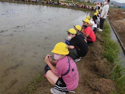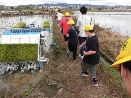5年生が田植えの様子を見学しに行きました。みんな田植え機に興味深々でした。