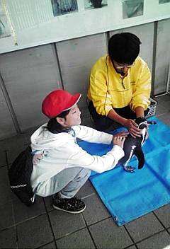 マリンランドでは,ペンギンに触れて大喜びです。