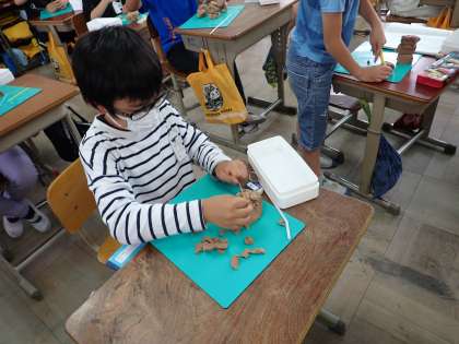 図工の時間に粘土を使って学習しました。1,2年生のように粘土をちぎって組み合わせてするだけでなく,切り糸やかきべらをつかって模様を作ったり,形を工夫して粘土を切ったりしました。