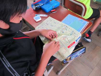 子どもたちの中には初めて針と糸で縫うという子も多く,楽しみにしていたようですが・・・玉結びと玉どめで早くも苦戦しています。