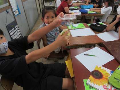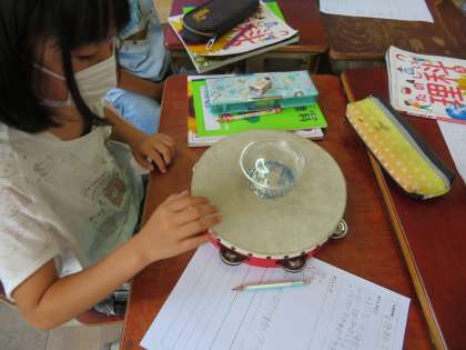 音が鳴った時の物の様子をビーズや輪ゴムの動きで確認しました。