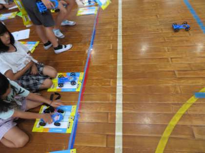 車を使って、ゴムや風にはどのような力があるかを実験しています。
