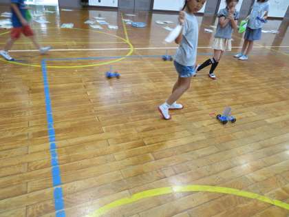 車を使って風の力の実験をしました。風を強くすると・・・弱くすると・・・