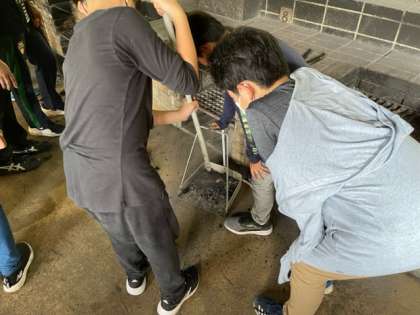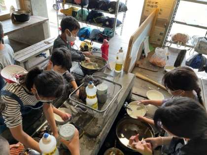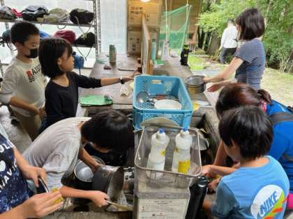 調理器具や食器など、たくさんあった洗い物もキレイに洗いました。その中でも、かまどの炎で真っ黒になったお鍋にはどのグループも苦労しました。洗剤と金たわしを使って、力を入れてゴシゴシ洗ってもなかなかきれいになりませんでしたが、明日次の学校の人が気持ちよく使えるようにと、きれいになるまで頑張りました。