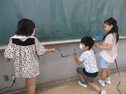 算数科では,「おおきさくらべ」を学習しました。友達と協力して,教室の色々な場所を調べて「長さ」を比べてみました。次は,「かさくらべ」に挑戦します。
