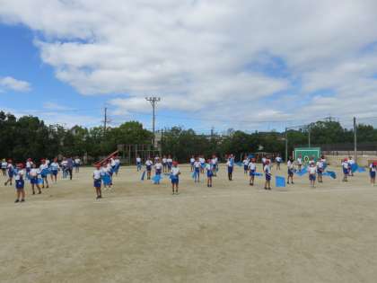神川スポーツフェスティバルに向けて、フラッグを使った演技に挑戦しています。前後左右間を保ちながら、息を合わせて取り組んでいます。