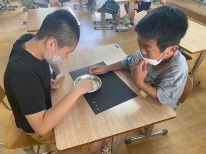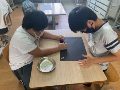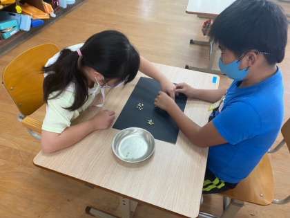 10のまとまりを作って,オクラのたねの数を数えました。電卓を使って,オクラ5本のたねの合計も計算しました。一番多いものでたねが70粒もありました。