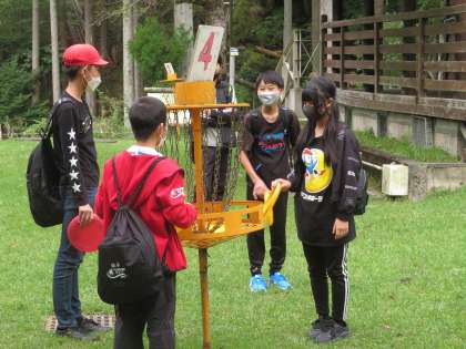 午後の活動は分かれて行いました。フライングディスクゴルフはディスクを投げ、ゴルフのように決められた回数内でゴールを目指しながら活動を進めていました。初めは、狙ったところに投げることが難しいようでしたが、回数を重ねるごとにどんどん上達していました。