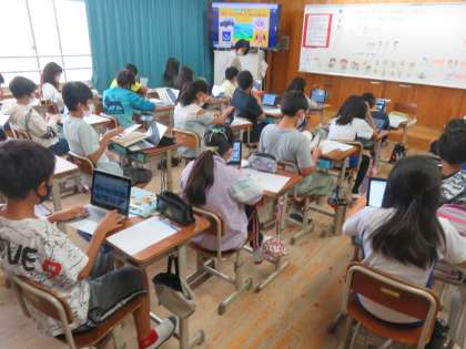 夏休みの思い出を英語で友だちに伝えるために、ロイロノートを使った準備をしています。「海ってなんて読むの?」など、英語の発音にも気をつけながらがんばっていました。