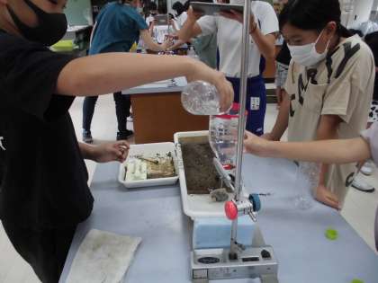 川にみたてた実験器具を使い、水を流して砂の変化の様子を観察しました。