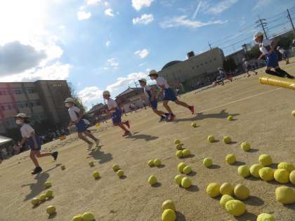 散らばった玉を拾い集め、一生懸命投げています。
