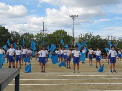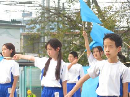 フラッグを使った演技の3曲目です。テンポが速くなりましたが、みんなで動きを合わせて演技をしています。
