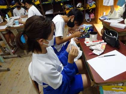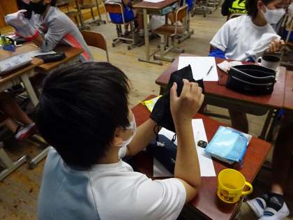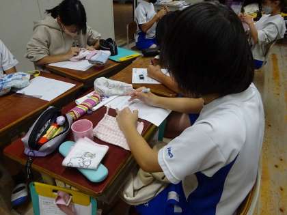 家庭科の学習では、巾着袋が作られるのにどんな工夫があるのかを観察し探しました。