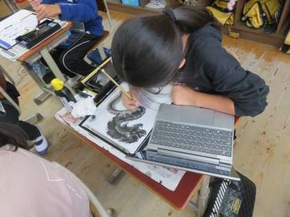 図画工作科の学習では、水墨画に挑戦しました。「墨汁だけで書くの?」とびっくりしていましたが、濃淡を意識しながら描くことができていました。