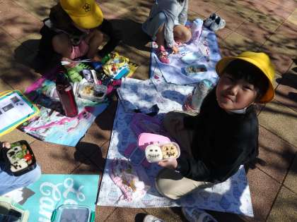 今日は、青空のもと京都市動物園に秋の遠足に行きました。到着してから、キリンやフラミンゴなどたくさんの動物に大興奮。それから、班でお弁当を食べました。おうちの人が作ってくれたお弁当にとっても嬉しそうな表情でした。