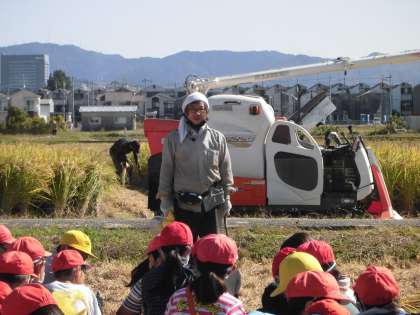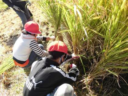 晴れわたる秋空の下、地域にお住いの皆様にお世話になり、稲刈りの体験をさせていただきました。