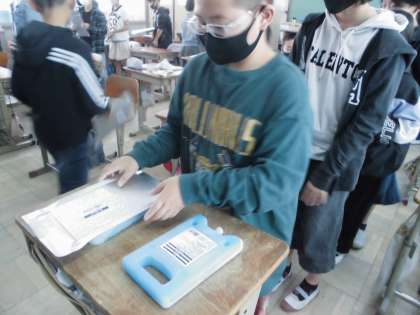 冷蔵庫にも使われている「真空断熱材」のすごさを自分のてのひらで確かめました。凍っている保冷剤を片手は直接、もう片方の手は「真空断熱材 ユーバキュア」を敷いて触りました。「うわっ!全然冷たくない!」と驚きの声が次々にあがりました。