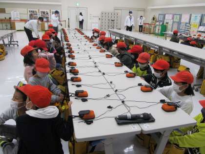 工場見学に出発する前に、イヤホンを装着します。一人一台、イヤホンが用意されていて、離れていてもパナソニックの職員さんの声が耳元で聞こえるという優れものです。