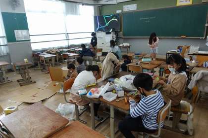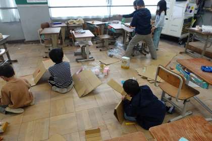 おもちゃを作りました。それを遊べるようにコースを作っています。