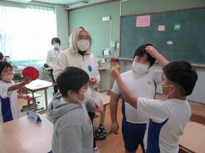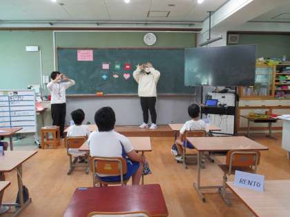 丸や四角などいろいろな形を英語で言う学習をしました。教室の中にあるいろいろな形を探す活動もみんな楽しんで取り組んでいました。
