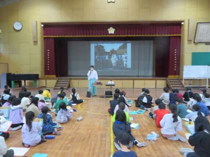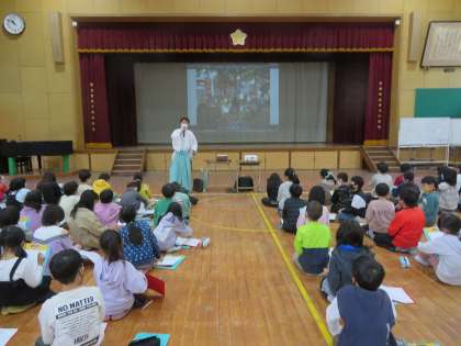菱妻神社の宮司さんに来ていただいて、神川地域のことや、菱妻神社のこと、千種祭のことなどを話していただきました。昔の神川地域のことや自分たちも演奏した千種ばやしのことなどに興味を持って、聞くことができました。