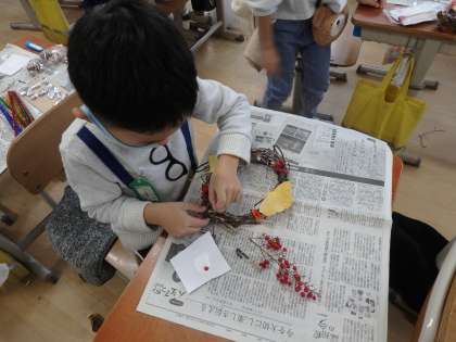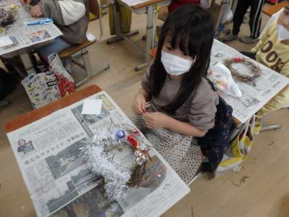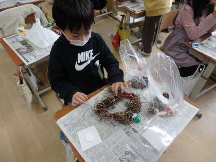 生活の授業で大切に育てたあさがおのつるを使って,リース作りをしました。どんぐりやまつぼっくり,りぼんやモールなどで可愛らしく飾り付けて,クリスマスのリースの出来上がり!とってもかわいいリースが出来て,楽しみなクリスマスが近づいてきたことを実感していました。